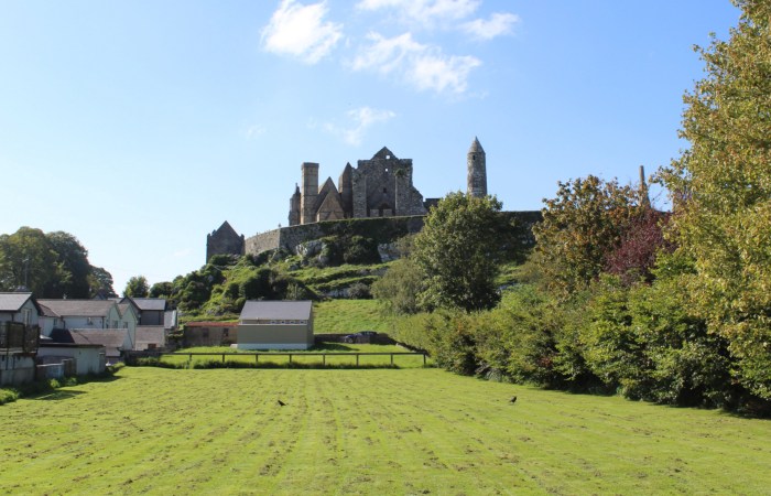 One thing that an American visitor quickly learns on a trip around Europe is that there are simply some parts of the landscape that cry out to be the site of a castle. At a time when every town was its own kingdom, a time before police forces or standing armies, a time of great scarcity and instability, it was only the presence of a castle that could guarantee the safety of the local ruling family. And the safest place for a castle is usually on the highest available ground—where enemies can be spotted from afar, and where attackers must struggle uphill. The outcropping of limestone that rises dramatically over the fertile, level land known as the “Golden Vale” is just such a place—a natural pedestal. You might even say that it was destined to be the site of a great edifice.