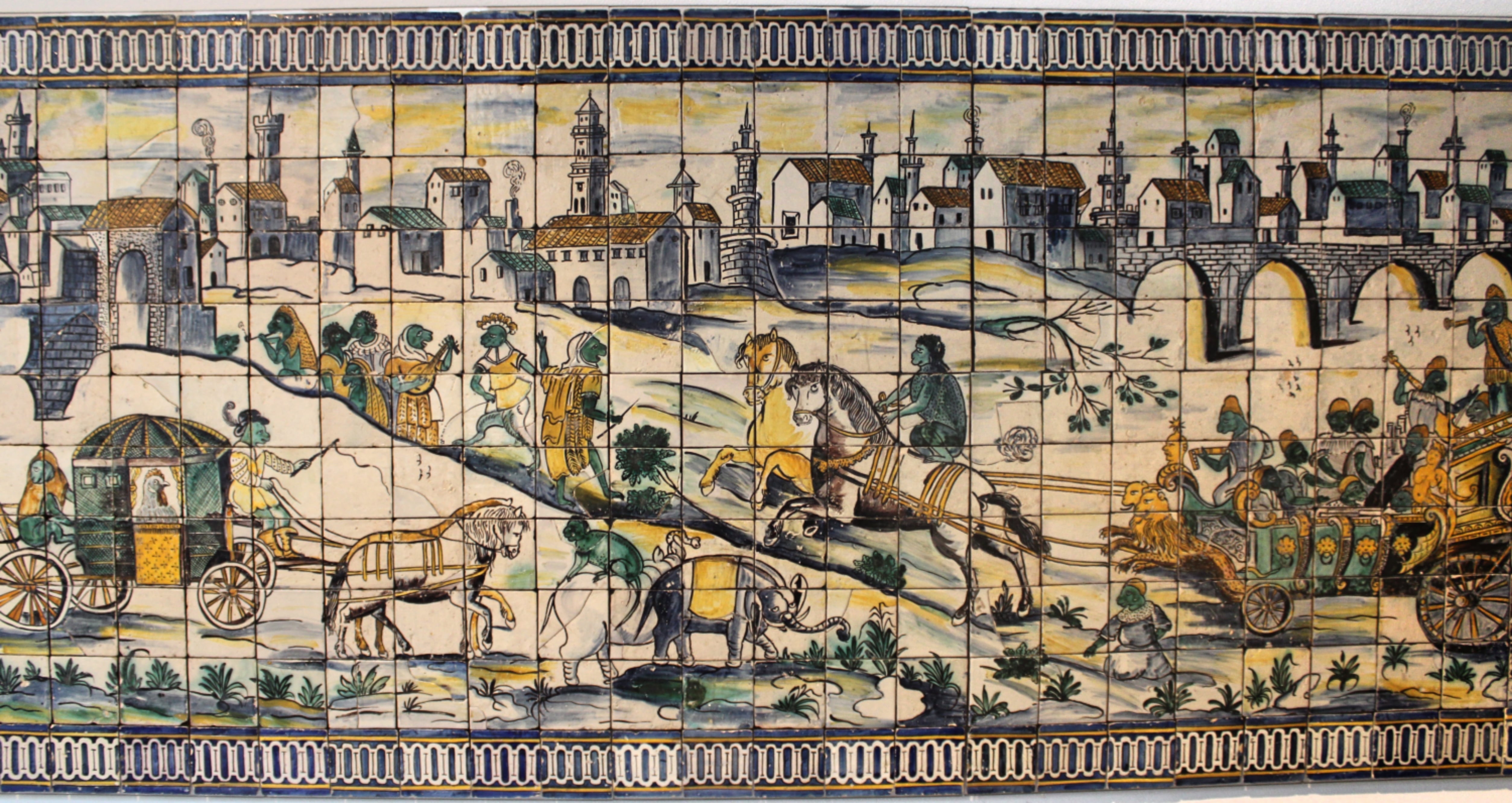 The collection offers a bit of history on the tradition of azulejos. As you may have intuited, the word is a loanword from Arabic, specifically the word for “small polished stone.” Any visitor to the Alhambra will know that decorative tile had a strong tradition in the Moorish world, the art of geometric design driven by the prohibition on depicting human forms. Even today, many if not most azulejos contain either geometric or plant motifs. However, this is certainly not always the case. Azulejo altarpieces depicting Jesus, Mary, and the saints were on display. Other tiles portrayed scenes of history or of daily life, like the tapestries that hung in many royal dwellings.