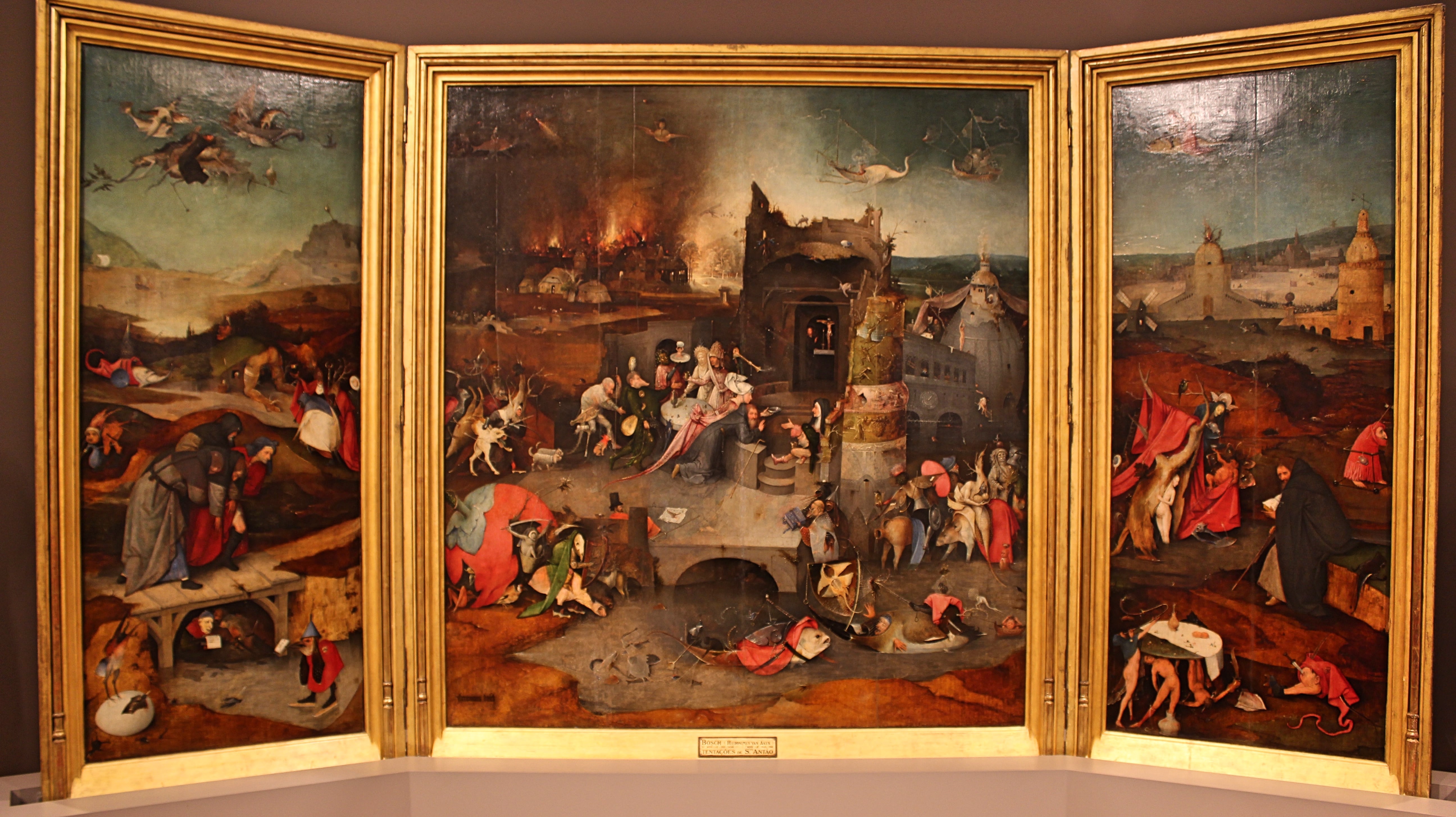 But my favorite work by a long shot was the Triptych of the Temptation of Saint Anthony by Hieronymous Bosch. Anthony was one of the early Christian ascetics, who isolated themselves in the desert in order to purify themselves. Bosch’s work represents the physical and spiritual temptations that the saint had to endure during his long years of fasting and prayer. As usual with Bosch, this gives rise to bizarre and fantastic imagery. The central panel is the main focus: showing the kneeling saint surrounded by the whole population of Bosch’s superfecund imagination: human-animal hybrids, men lacking limbs and even whole bodies, fish wearing armor, ruined buildings and burning cities—each of these images visually fantastic and symbolic of sin. It seems that Bosch had a both a horror and a fascination of sin, since he was so adept at portraying it.