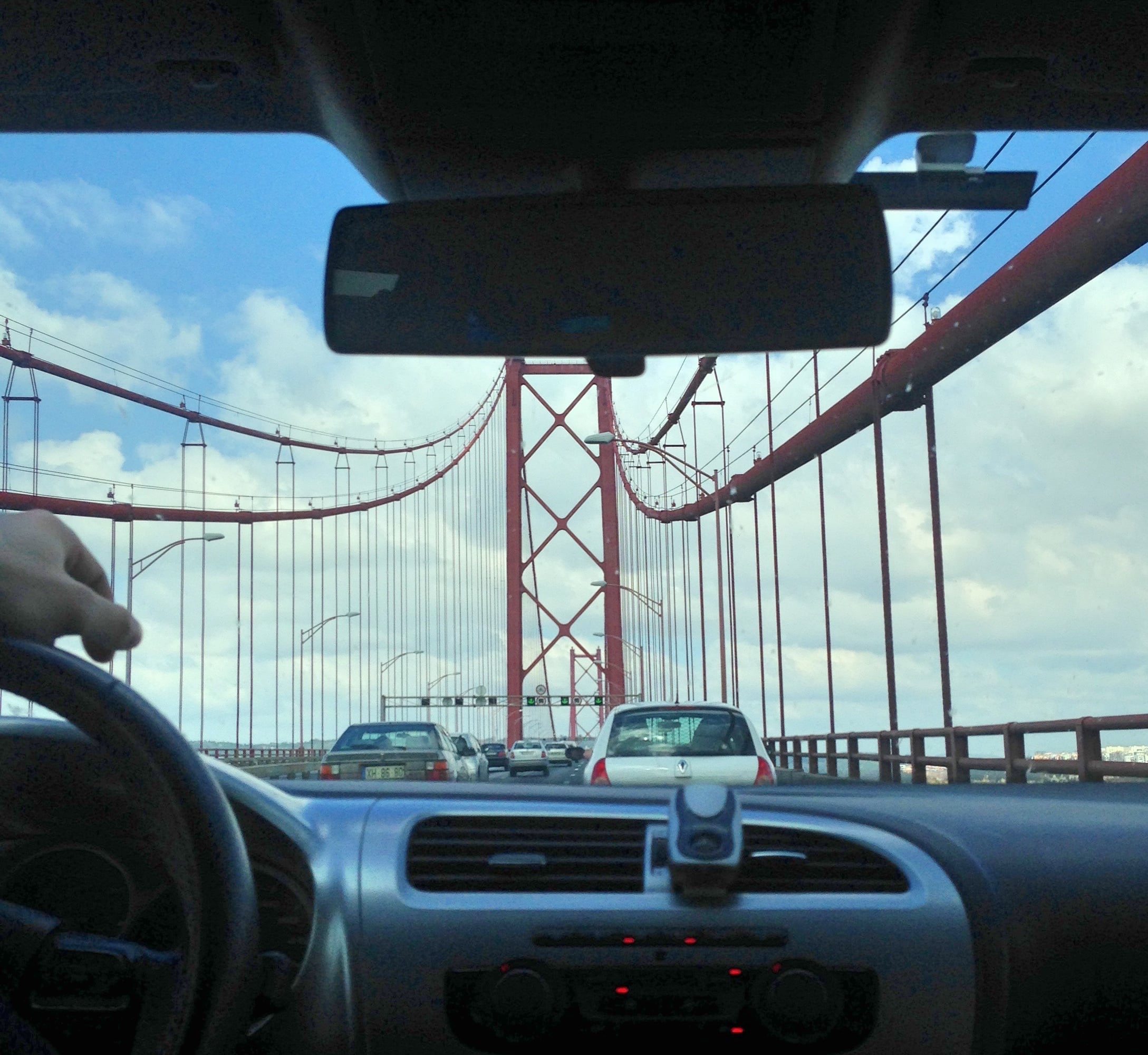 We entered the city on the majestic 25 de Abril Bridge—a suspension bridge conspicuously reminiscent of the Golden Gate Bridge of San Francisco. (The 25th of April, 1974, is the date of the famous Carnation Revolution, when the dictatorship was overthrown.) Two massive towers hold up a double-decker span over the river Tagus, the whole thing painted a rusty red color. Next to the bridge is another monument that recalls a foreign city: Christ the King, a tall statue of Jesus inspired by the famous Christ the Redeemer in Rio de Janeiro. Through the cables of the bridge we could see the city of Lisbon huddled on the riverbank, its colorful tiles shining in the sunlight. This was my first glimpse of the city.