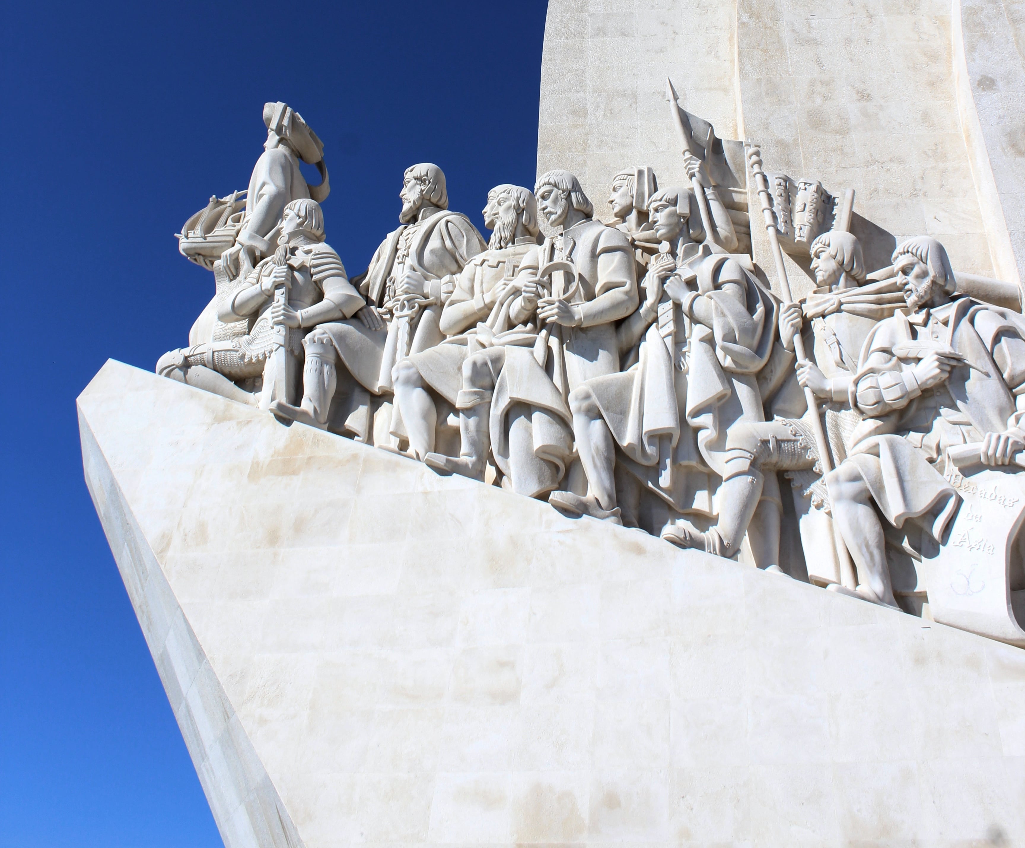 Just down the river from the tower is the Monument to the Discoveries. This is a far more recent construction, having been built in 1939 for the Portuguese World Exhibition. It is a worthy addition to the area. The massive concrete fin is shaped like the prow of a ship; and riding on top, in a heroic procession, are great figures from Portugal’s Age of Discovery. In the space in front of the monument, a large mosaic compass has been inserted into the pavement. In the center is a map of the world, with the names of notable explorers and the dates of their voyages marked. Most of the figures aboard the ship are, I am afraid, unknown to me. But at the tip is Henry the Navigator, the Prince who helped to inaugurate and coordinate the first Portuguese explorations.