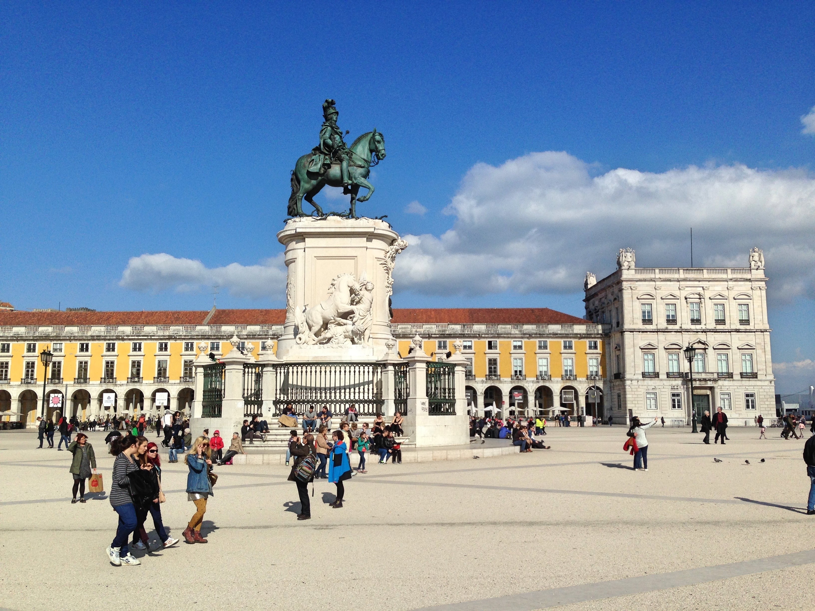To continue with my overview of the city, we turn next to Baixa. It stands in the heart of the city, and at the heart of Baixa is the Plaça do Comécio. This is a grand, monumental square that opens up right to the River Tagus. An equestrian statue of Joseph I of Portugal stands at the center of the yellow buildings, with the king looking warlike and formidable despite being mainly dedicated to opera during his reign. In this area are to be found high-end shopping and touristy restaurants, which I like to avoid. Right next to Baixa is Chiado, a similar zone of shopping and restaurants, containing some of the city’s central plazas.