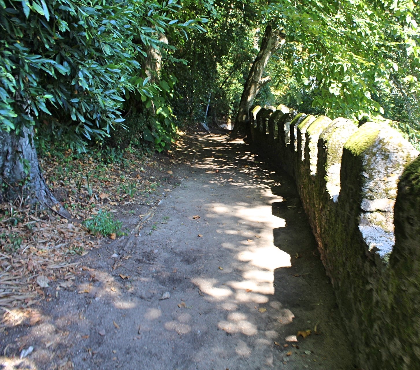 It is an extremely romantic spot. Grey granite walls rise out of the trees, snaking around the hillside. The visitor can walk along these walls, enjoying the unsurpassable view of the surrounding countryside. Below one can see the town of Sintra itself, ensconced in the forest and centered around the palace, with the green countryside beyond speckled with habitations as the land spreads out until the blue sea in the far distance. Though the hill is not very high, standing atop the walls and looking down gives one an amazing sense of height. Aside from the view, the castle itself spurs the imagination. Its crumbling form, wrapping around little but empty forest, evokes a faraway time. Like all ruins, the fortification’s very incompleteness invites fantasy.